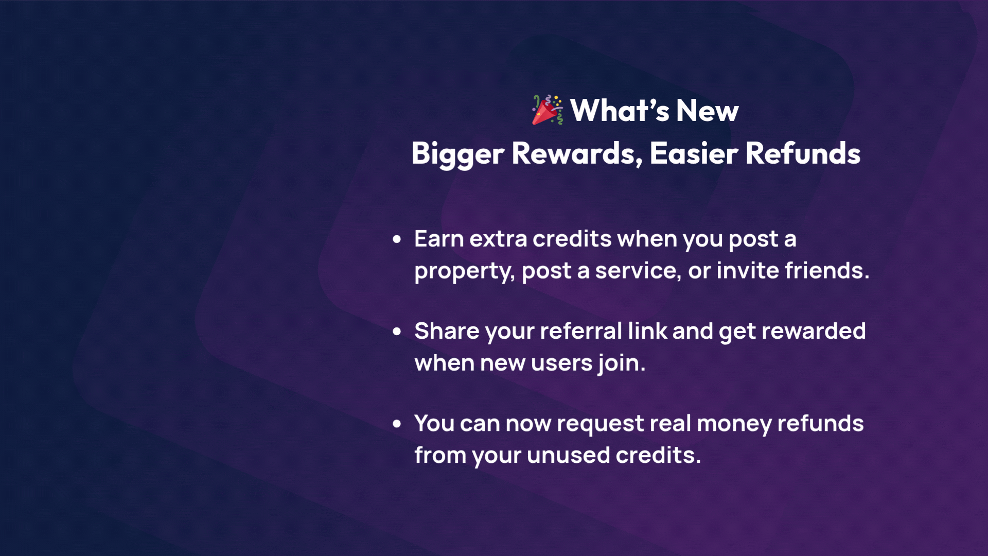 Reward Credits – Earn bonus credits when you post a property, post a service, or refer a friend.